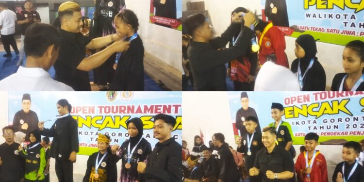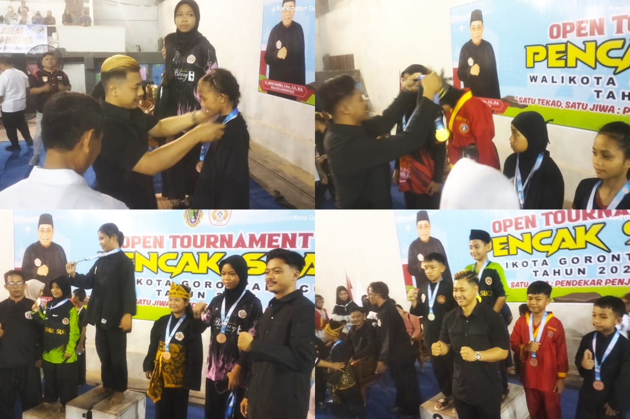 Pengalungan medali dilakukan oleh jawara nasional, Hanifan dan Paski, yang turut didampingi panitia pelaksana sebagai simbol penghargaan atas prestasi atlet muda dalam mengharumkan cabang olahraga pencak silat di daerah Gorontalo.
