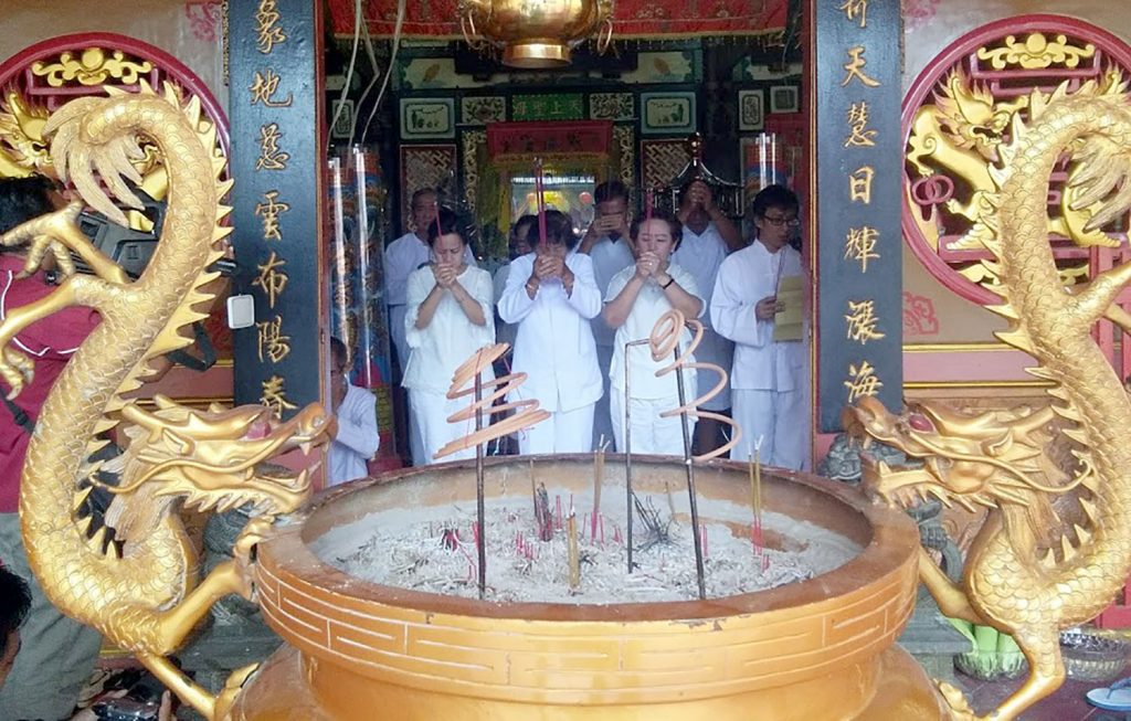 Umat Tri Dharma melakukan upacara Po Poe, atau upacara meminta restu Yang Suci Thian Siang Seng Bo, di klenteng Tulus Harapan Kita, jumat (8/2/2019). Foto: Lukman Polimengo.