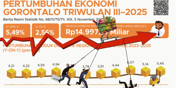 Pelaksana tugas (Plt) Kepala BPS Provinsi Gorontalo, Dwi Alwi, dalam rilis resmi yang digelar di kantor BPS Gorontalo, Rabu (5/11/2025), menyampaikan bahwa ekonomi Gorontalo triwulan III-2025 terhadap triwulan III-2024 (year-on-year) tumbuh 5,49 persen.