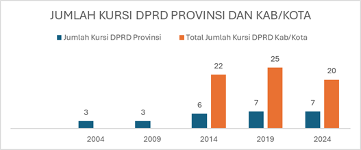 Berbeda dengan DPR RI, di DPRD Provinsi Gorontalo PDI Perjuangan mengalami konsolidasi yang jauh lebih jelas. Dari 3 kursi pada 2004 dan 2009, partai ini melonjak menjadi 6 kursi pada 2014 dan kemudian stabil pada 7 kursi pada 2019 dan 2024. Secara perolehan suara pada level provinsi, PDI Perjuangan meraih 90.847 suara pada 2019 dan meningkat menjadi 104.739 suara pada 2024, naik 13.892 suara dalam satu siklus. Peningkatan ini memberikan gambaran bahwa PDI-P telah menjadi salah satu kekuatan yang terinstitusionalisasi di tingkat provinsi, dengan basis elektoral yang bukan hanya bertahan, tetapi meluas.