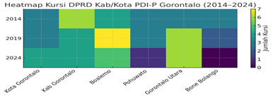 Pada level DPRD kabupaten/kota, peta kekuatan PDI-P menjadi lebih bernuansa. Pada Pemilu 2014, PDI-P meraih 3 kursi di Kota Gorontalo, 6 di Kabupaten Gorontalo, 4 di Boalemo, 3 di Pohuwato, 3 di Gorontalo Utara, dan 3 di Bone Bolango, total 22 kursi. Pada 2019, peta ini bergeser menjadi 3 di Kota Gorontalo, 4 di Kabupaten Gorontalo, 7 di Boalemo, 3 di Pohuwato, 6 di Gorontalo Utara, dan 2 di Bone Bolango (total 25 kursi), dan pada 2024 menjadi 4 di Kota Gorontalo, 4 di Kabupaten Gorontalo, 5 di Boalemo, 1 di Pohuwato, 6 di Gorontalo Utara, dan 0 kursi di Bone Bolango (total 20 kursi). Data ini menunjukkan pola: Boalemo dan Gorontalo Utara mengkristal sebagai basis inti PDI-P, Kabupaten Gorontalo dan Kota Gorontalo sebagai basis penyangga yang cukup stabil, sementara Pohuwato dan terutama Bone Bolango menjadi zona rentan, bahkan runtuh pada 2024. Dari sini dapat disimpulkan: PDI Perjuangan di Gorontalo kuat sebagai kekuatan provinsi dan kabupaten tertentu, tetapi masih tertahan di pintu DPR RI. Kekuatan ini sangat teritorial dan sangat bergantung pada konfigurasi elite lokal, sehingga target 30–12–1 yang dicanangkan Ahmad Basarah mensyaratkan kerja penguatan yang lebih terukur di semua tingkat.