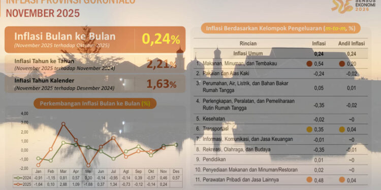 Gorontalo, mimoza.tv – Laju pertumbuhan ekonomi Gorontalo pada November 2025 menunjukkan dinamika yang saling tarik-menarik. Di satu sisi, tekanan inflasi tetap terkendali pada level 0,24 persen (month-to-month), namun di sisi lain, Nilai Tukar Petani (NTP) justru mengalami penurunan cukup terasa.
