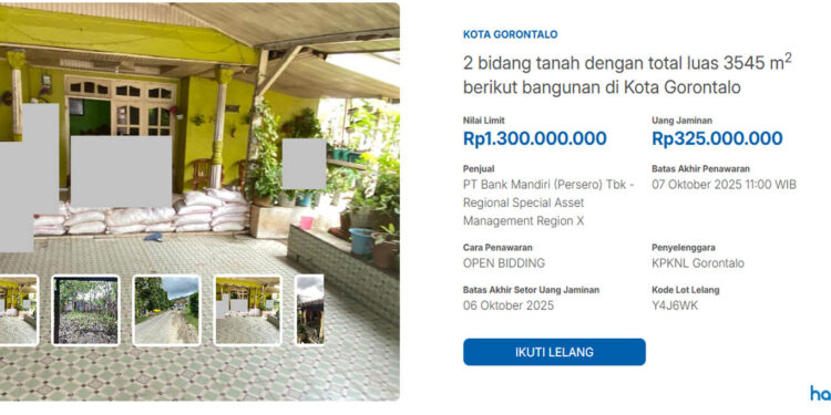 Gorontalo, mimoza.tv – Sebuah hunian dengan lahan luas mencapai 3.545 meter persegi yang terdiri atas dua bidang tanah berikut bangunan di atasnya, resmi masuk daftar lelang terbuka (open bidding) yang digelar Kantor Pelayanan Kekayaan Negara dan Lelang (KPKNL) Gorontalo.