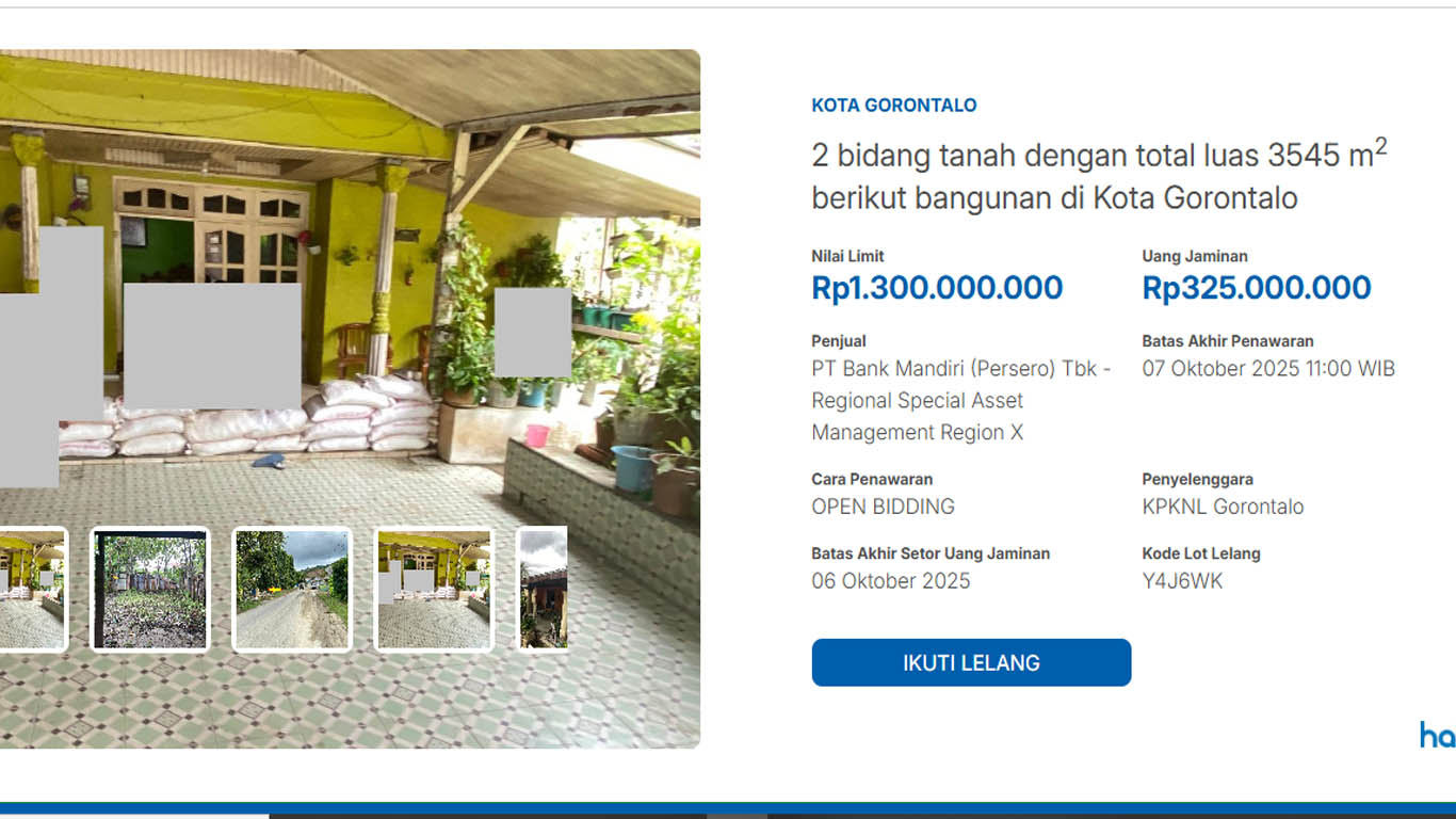 Properti tersebut dilepas dengan nilai limit Rp1.300.000.000 dan mensyaratkan uang jaminan sebesar Rp325.000.000. Penawaran akan ditutup pada 7 Oktober 2025 pukul 11.00 WITA, sementara batas akhir setor jaminan ditetapkan pada 6 Oktober 2025.