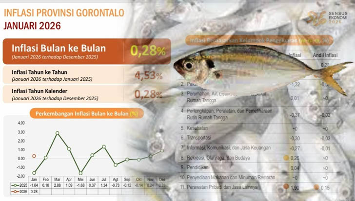 “Sebenarnya beberapa komoditas utama juga mengalami penurunan, seperti cabai rawit dan bawang merah. Tapi karena nilai ikan lebih tinggi, akhirnya inflasi Gorontalo masih positif di angka 0,28 persen, sementara secara nasional sudah negatif,” jelasnya.