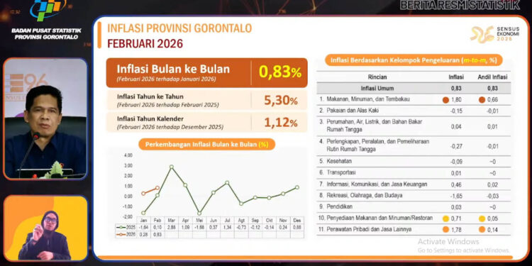“Pada Februari 2026, Provinsi Gorontalo mengalami inflasi year on year sebesar 5,30 persen yang dipicu kenaikan harga pada sejumlah kelompok pengeluaran,” ujarnya.