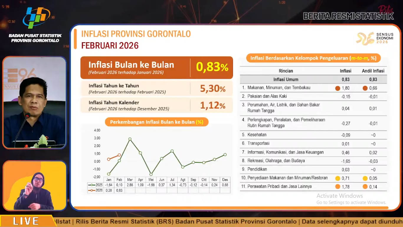 “Pada Februari 2026, Provinsi Gorontalo mengalami inflasi year on year sebesar 5,30 persen yang dipicu kenaikan harga pada sejumlah kelompok pengeluaran,” ujarnya.