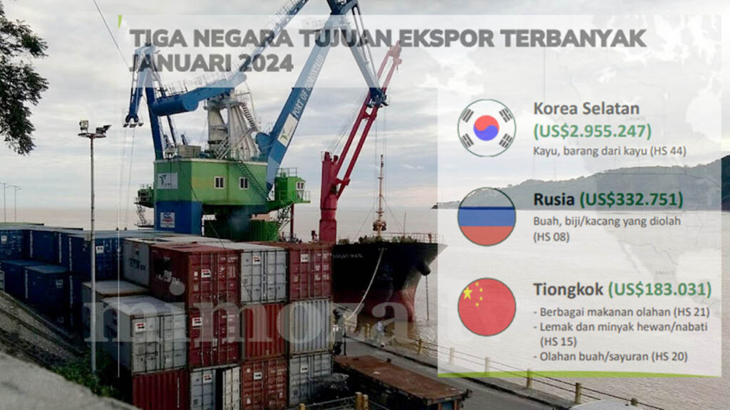 Gorontalo, mimoza,tv – Badan Pusat Statistik (BPS) Provinsi Gorontalo mengungkap, Korea Selatan (Korsel), Rusia, dan Tiongkok jadi tiga negara tujuan ekspor terbanyak dari Gorontalo pada bulan Januari 2024. Hal itu disampaikan oleh Kepala BPS Provinsi Gorontalo, Mukhamad Mukhanif, dalam press rilis fenomena pertumbuhan ekonomi di Gorontalo, Jumat (1/3/2024).