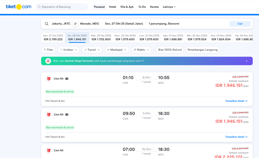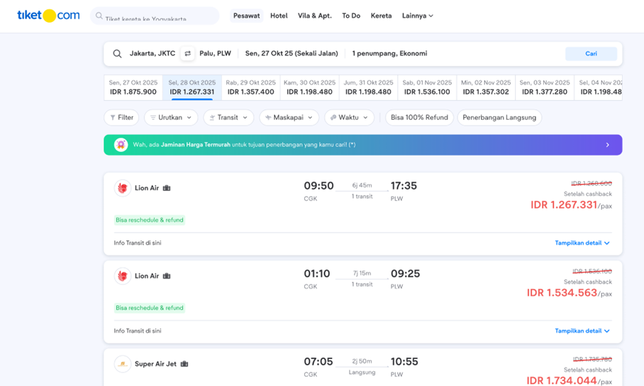 | Harga Tiket Pasar (27 Okt 2025) | IDR 3.085.091 – IDR 3.852.802 | IDR 1.267.331 – IDR 1.734.044 | IDR 1.946.151 – IDR 2.225.172 |