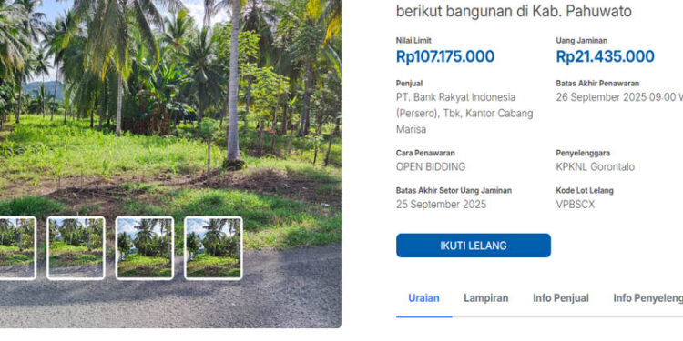 Pohuwato, mimoza.tv – Bagi warga yang tengah mencari lahan luas dengan harga terjangkau, ada peluang menarik dari Kantor Pelayanan Kekayaan Negara dan Lelang (KPKNL) Gorontalo. Sebidang tanah seluas 1.429 meter persegi berikut bangunan di atasnya, berlokasi di Kabupaten Pohuwato, resmi dilelang dengan harga limit Rp107.175.000.