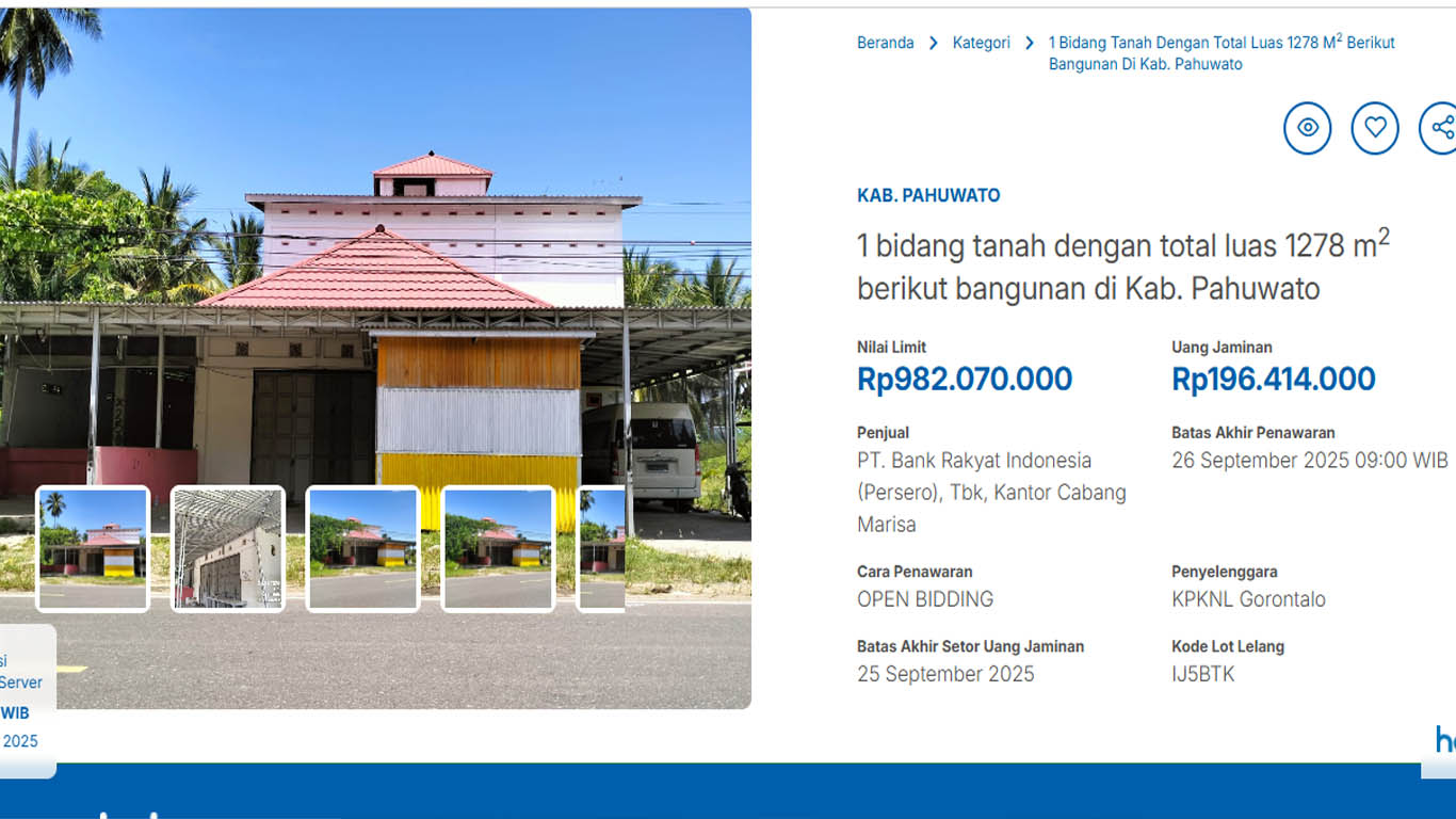 - Penjual: PT Bank Rakyat Indonesia (Persero) Tbk, Kantor Cabang Marisa