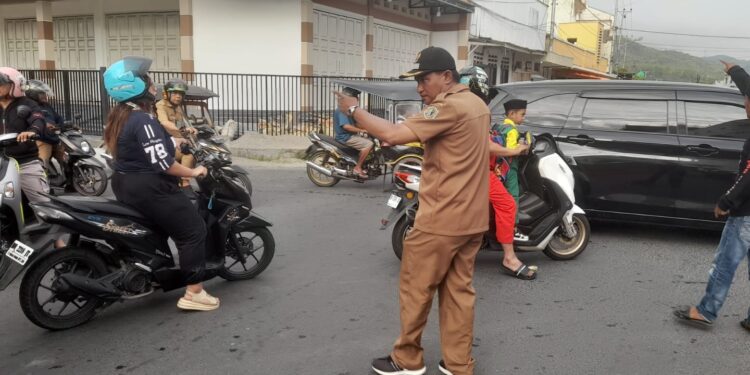 Di tengah kondisi tersebut, Lurah Biawao, Nurhadi Taha, terlihat turun langsung ke jalan membantu mengatur arus kendaraan. Ia dibantu sejumlah warga yang berada di sekitar lokasi.