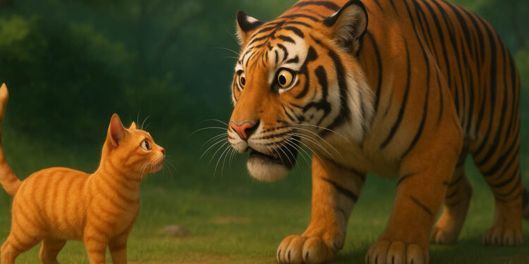 Gorontalo, mimoza.tv – Di tengah derasnya arus video viral di media sosial, ada satu fenomena yang mencuri perhatian publik: seekor harimau—raja rimba—tampak gentar di hadapan seekor kucing rumahan. Pemandangan ini banyak beredar di TikTok, Instagram, hingga YouTube Shorts. Sekilas terlihat lucu, tapi di baliknya tersimpan penjelasan ilmiah yang menarik: mengapa makhluk sekuat harimau bisa memilih mundur dari kucing kecil?
