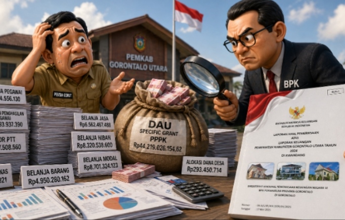 GORONTALO UTARA, mimoza.tv – Laporan hasil pemeriksaan Badan Pemeriksa Keuangan mengungkap penggunaan Dana Alokasi Umum (DAU) Specific Grant PPPK Pemerintah Kabupaten Gorontalo Utara tahun anggaran 2023 sebesar Rp44.219.026.154,62 tidak sepenuhnya sesuai dengan tujuan sumber pendanaan sebagaimana mestinya.