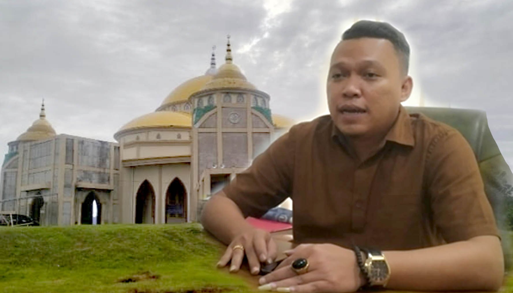 Pelaksana Tugas Kepala Seksi Pidana Khusus Kejari Gorontalo Utara, Bagas Prasetyo Utomo dan gambar latar Masjid Jabal Iqro. Foto: Lukman/mimoza.tv.