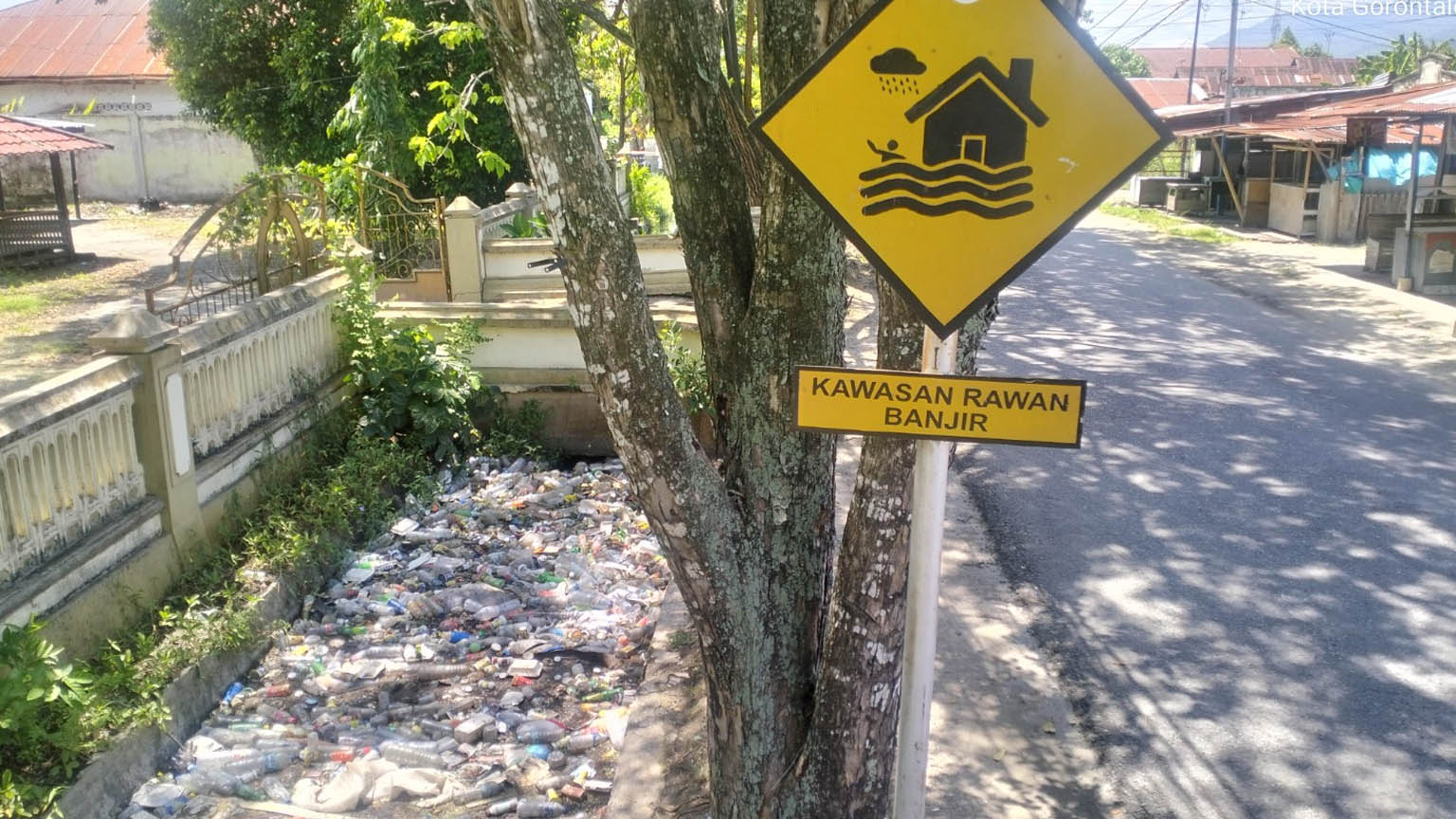 Rambu “Kawasan Rawan Banjir” berdiri tegak di Jalan Cendrawasih, Kota Gorontalo, namun saluran drainase di sisinya justru dipenuhi sampah. Ironi yang mencerminkan masih rendahnya kesadaran lingkungan, sekaligus menjadi ancaman nyata bagi potensi banjir di kawasan tersebut. Foto: Lukman/mimoza.tv