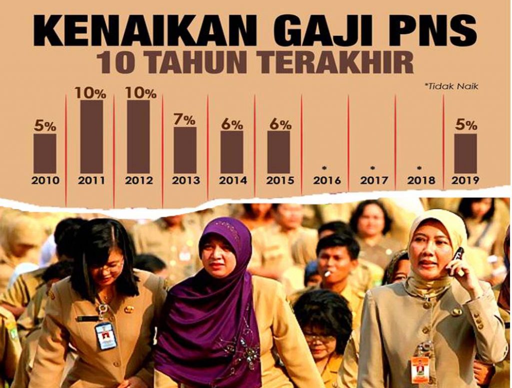 Sekadar gambaran, kenaikan gaji PNS 5%, yang juga berlaku untuk TNI/Polri, berdasarkan atas Peraturan Pemerintah (PP) Nomor 15 Tahun 2019 tentang Perubahan Kedelapan Belas Atas Peraturan Pemerintah Nomor 7 Tahun 1977 tentang Peraturan Gaji Pegawai Negeri Sipil.