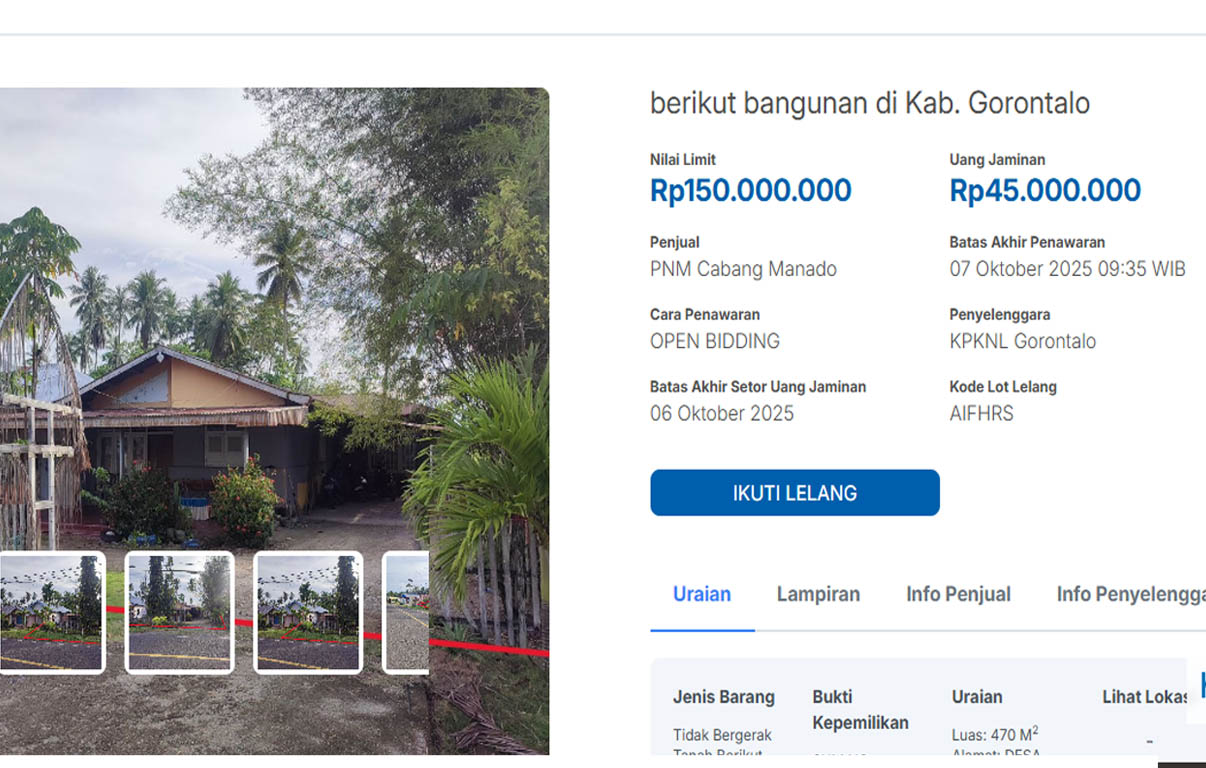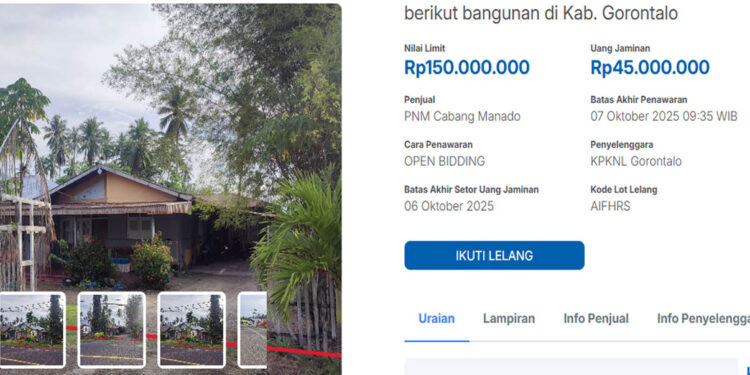 Gorontalo, mimoza.tv – Satu bidang tanah dengan luas 470 meter persegi berikut bangunan rumah di atasnya, akan dilelang melalui Kantor Pelayanan Kekayaan Negara dan Lelang (KPKNL) Gorontalo. Properti yang berlokasi di Kabupaten Gorontalo ini dibuka dengan nilai limit Rp150 juta.