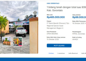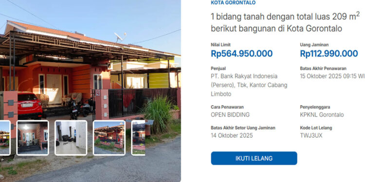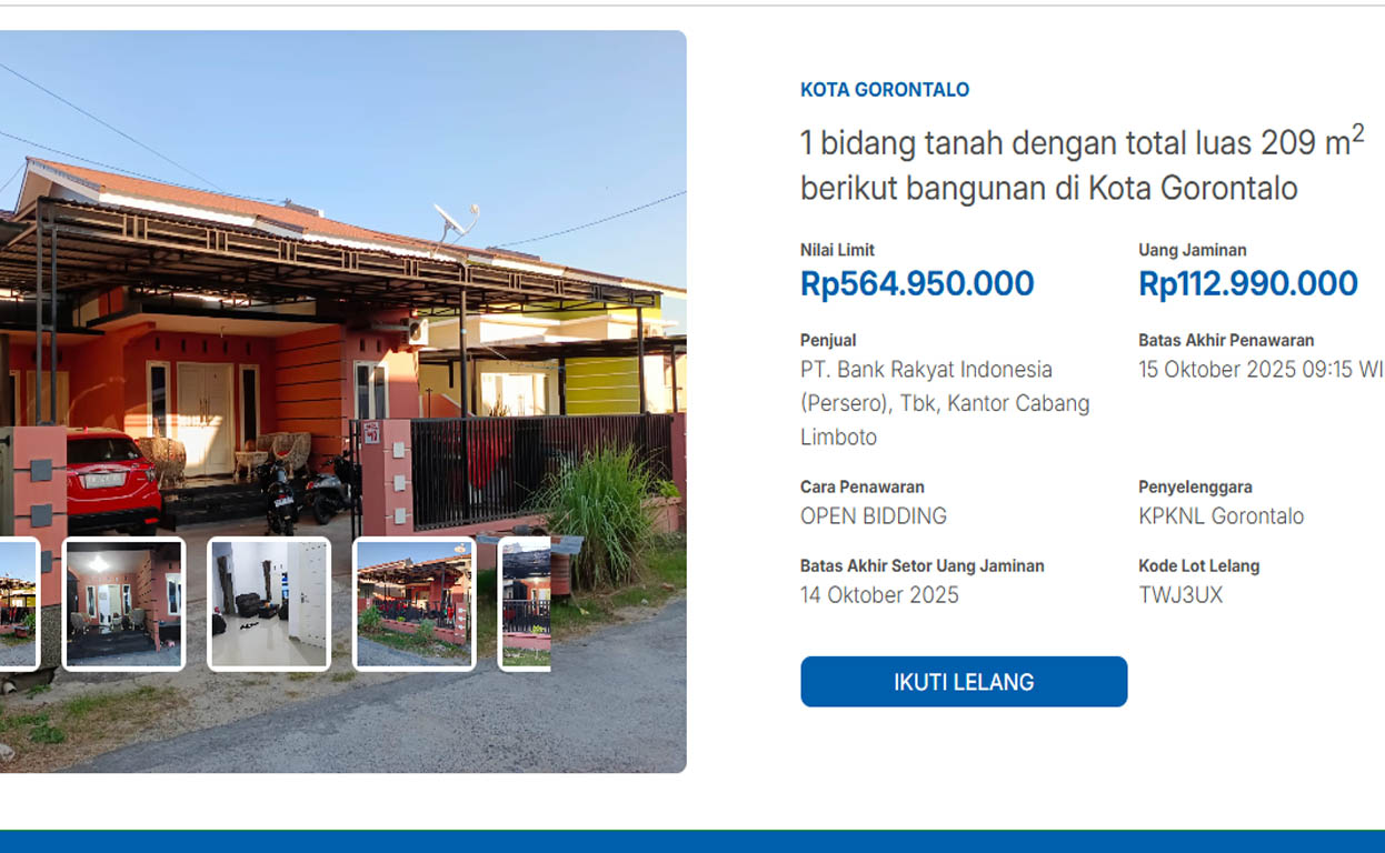Aset tersebut tercatat sebagai milik PT Bank Rakyat Indonesia (Persero) Tbk, Kantor Cabang Limboto, dengan penyelenggara lelang KPKNL Gorontalo. Penawaran dilakukan dengan sistem open bidding, dan batas akhir penawaran ditetapkan pada 15 Oktober 2025 pukul 09.15 WITA, sementara setoran uang jaminan harus masuk paling lambat 14 Oktober 2025.