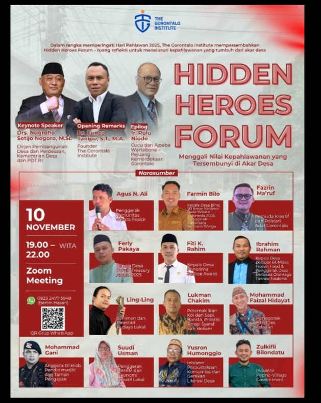 Ruang Refleksi dan ApresiasiHidden Heroes Forum merupakan bagian dari rangkaian program reflektif The Gorontalo Institute yang berfokus pada pembangunan nilai, pengetahuan, dan kepemimpinan berbasis masyarakat.