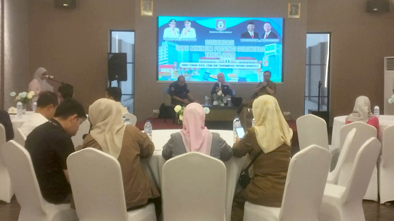 Gorontalo, mimoza.tv – Dinas Tenaga Kerja dan Transmigrasi (Disnakertrans) Provinsi Gorontalo menggelar sosialisasi Upah Minimum Provinsi (UMP) Tahun 2026 yang telah ditetapkan melalui Surat Keputusan Gubernur Gorontalo. Kegiatan tersebut berlangsung di salah satu gedung di Kota Gorontalo, Senin (23/12/2025), dan dihadiri perwakilan perusahaan, dinas terkait, serta asosiasi pekerja.
