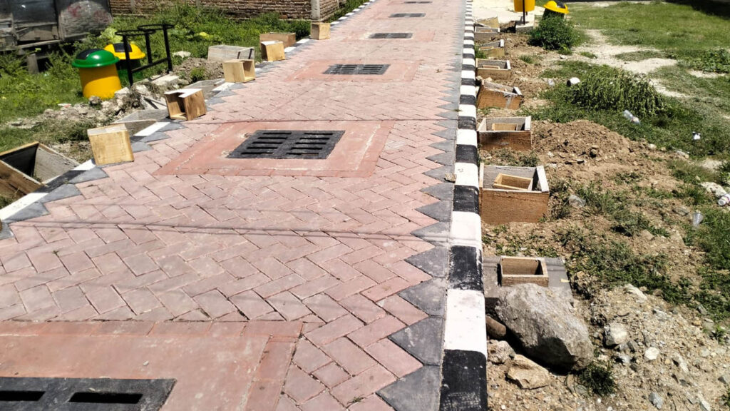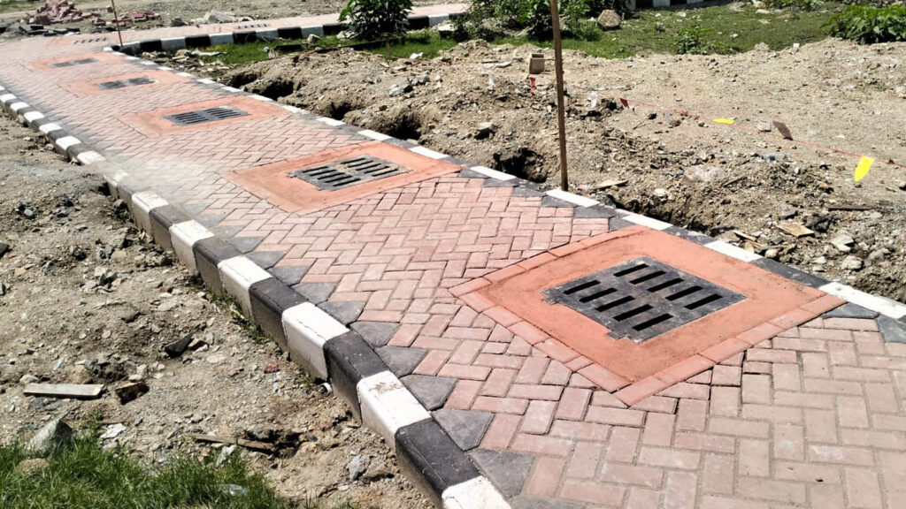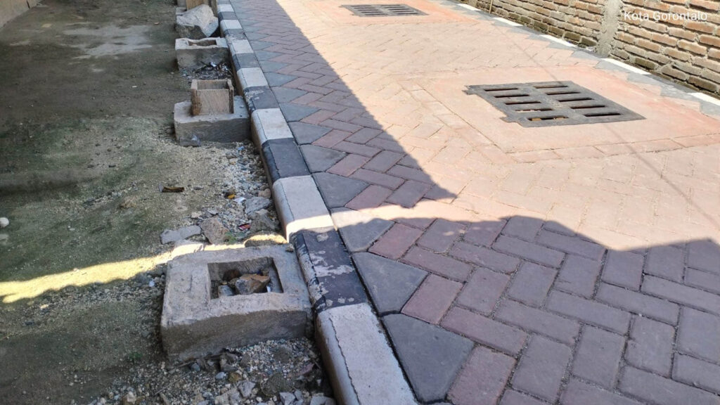 Di sepanjang jalan paving block, sejumlah lubang saluran air di tepi jalan terlihat belum tertutup. Beberapa di antaranya bahkan masih dalam tahap penggalian. Material konstruksi masih berserakan di beberapa titik. Tanah di sekitar saluran tampak belum dirapikan sepenuhnya.